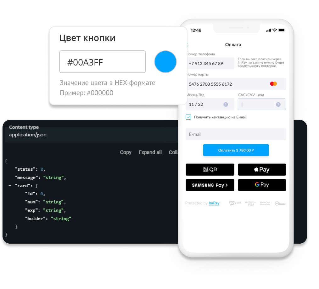Набор средств для любой формы интеграции и методов оплаты. Подключение через платежный виджет ImPay, CMS модули, API протокол взаимодействия или свою брендированную платежную страницу. Виджет представлен в виде трех различных форм, настраивается под цвета партнера, в качестве опций можно добавить форму доставки, поля email и SMS для передачи чека, и корзину маркетплэйса.