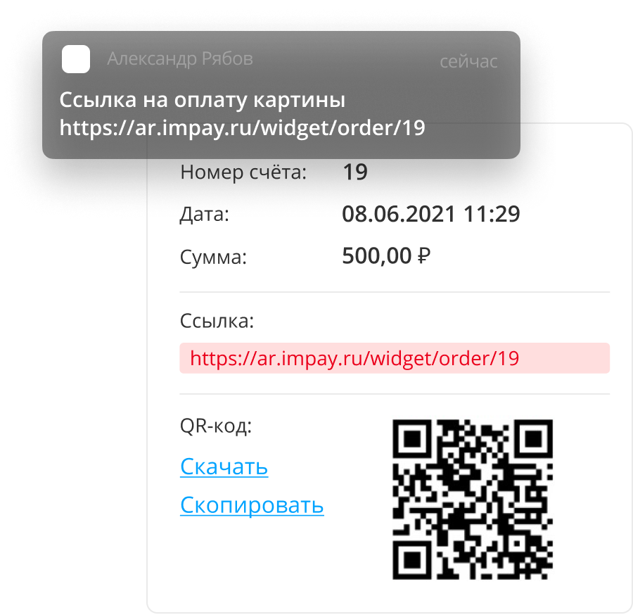 Сервис позволяет сформировать ссылку на свою платежную страницу для приема платежей и отправить ее на email, SMS или мессенджер (чат). Ее можно разместить на своей странице в соцсети или распечатать в QR-коде на любом носителе.